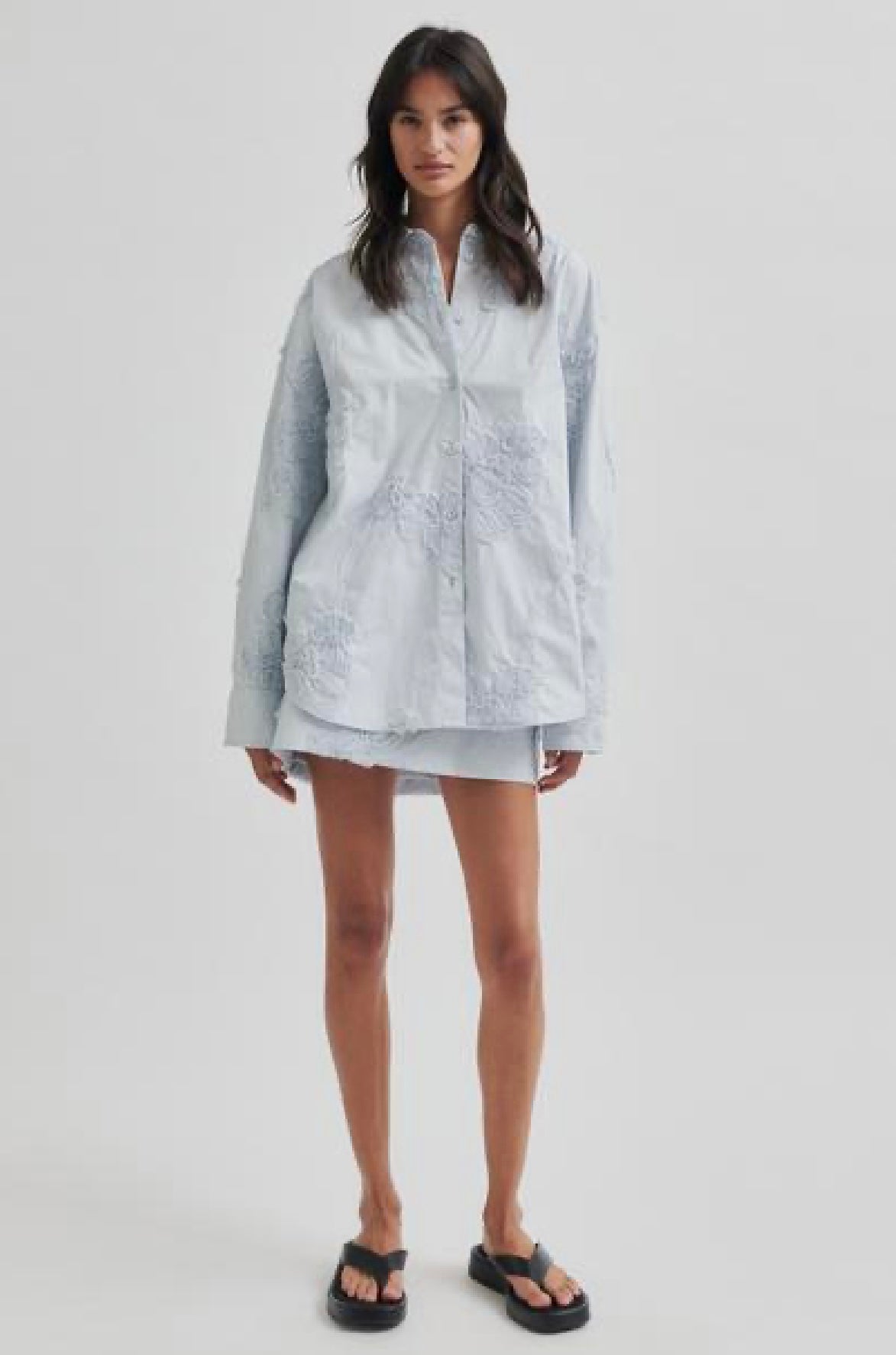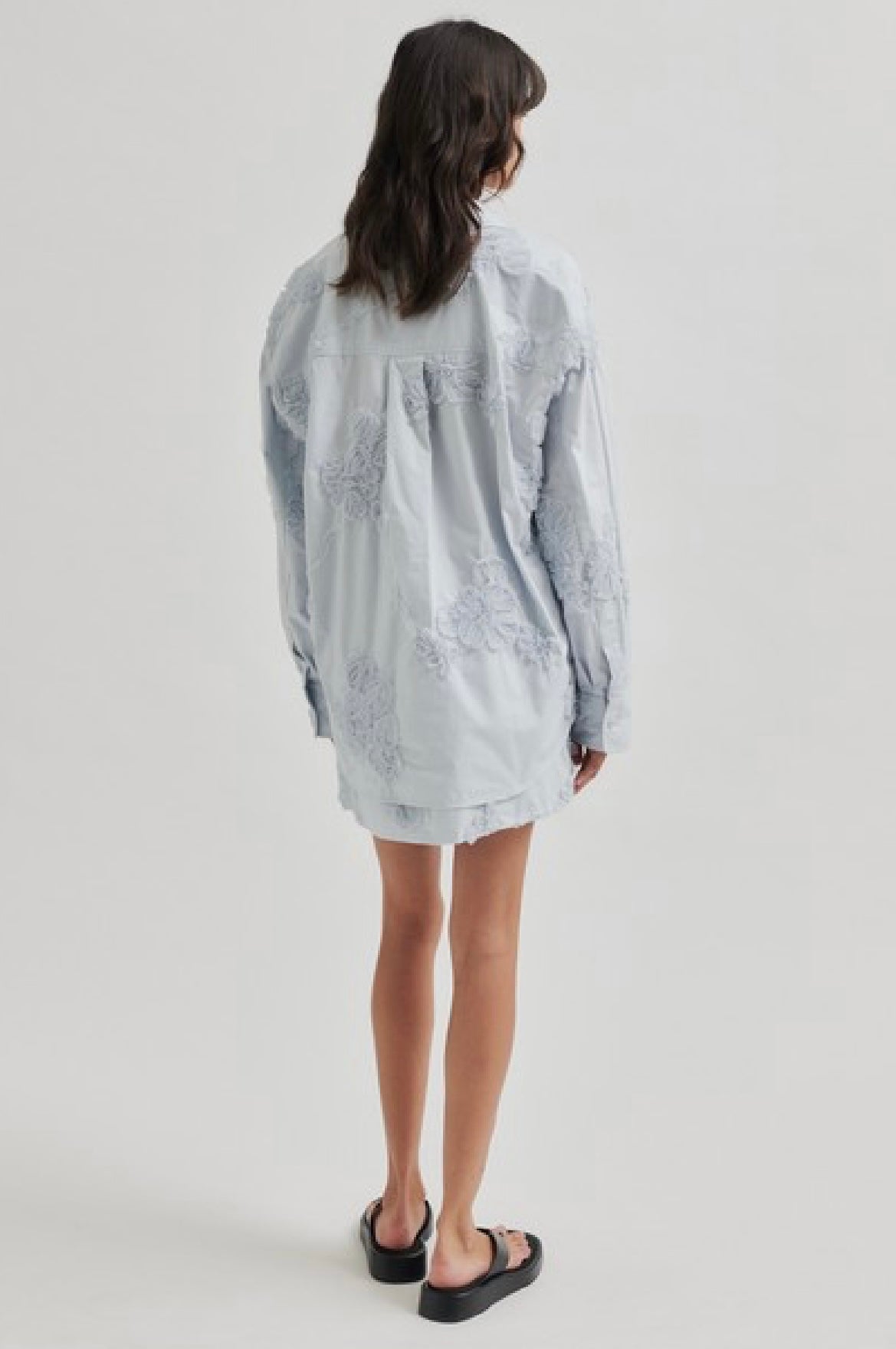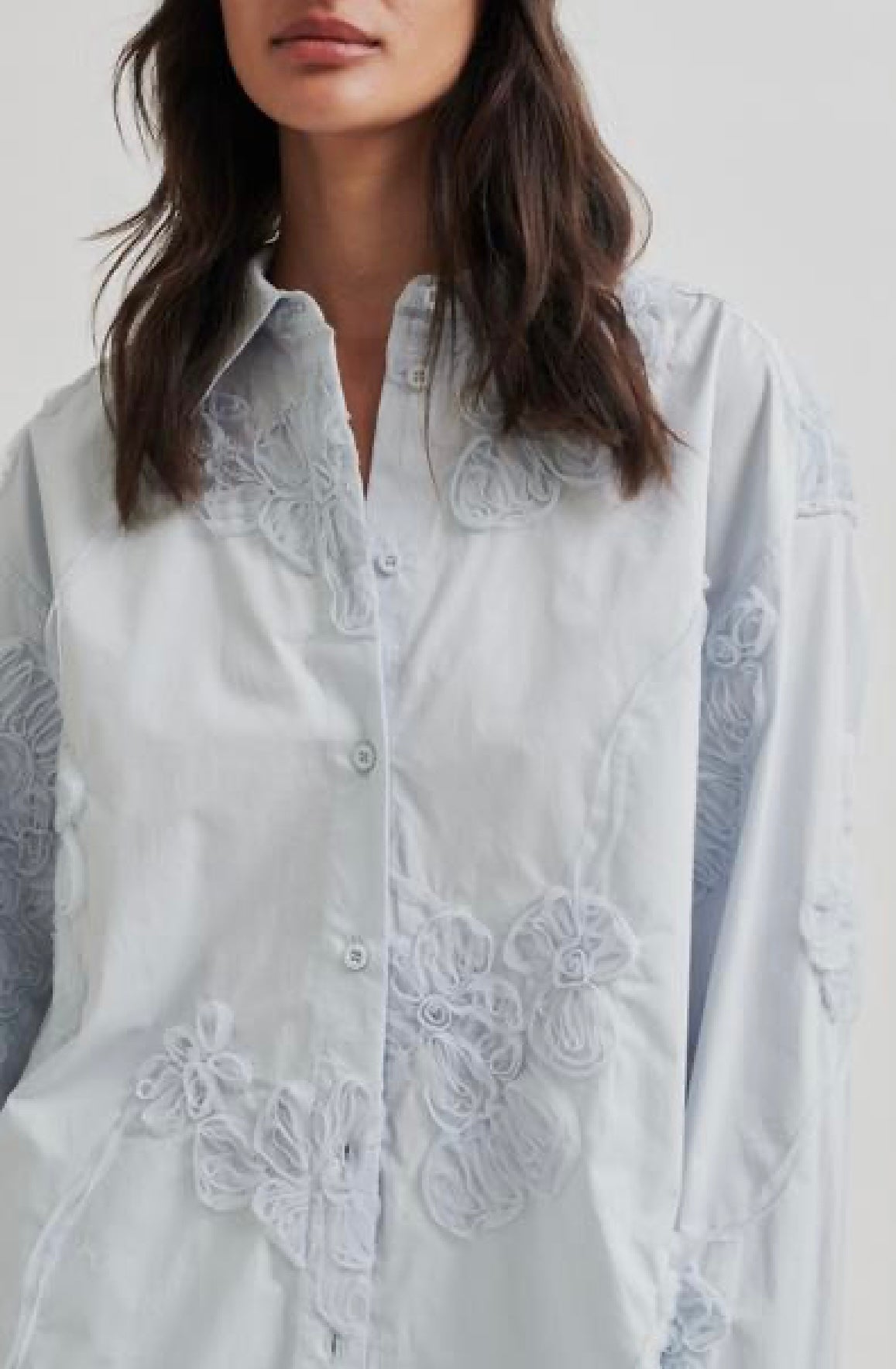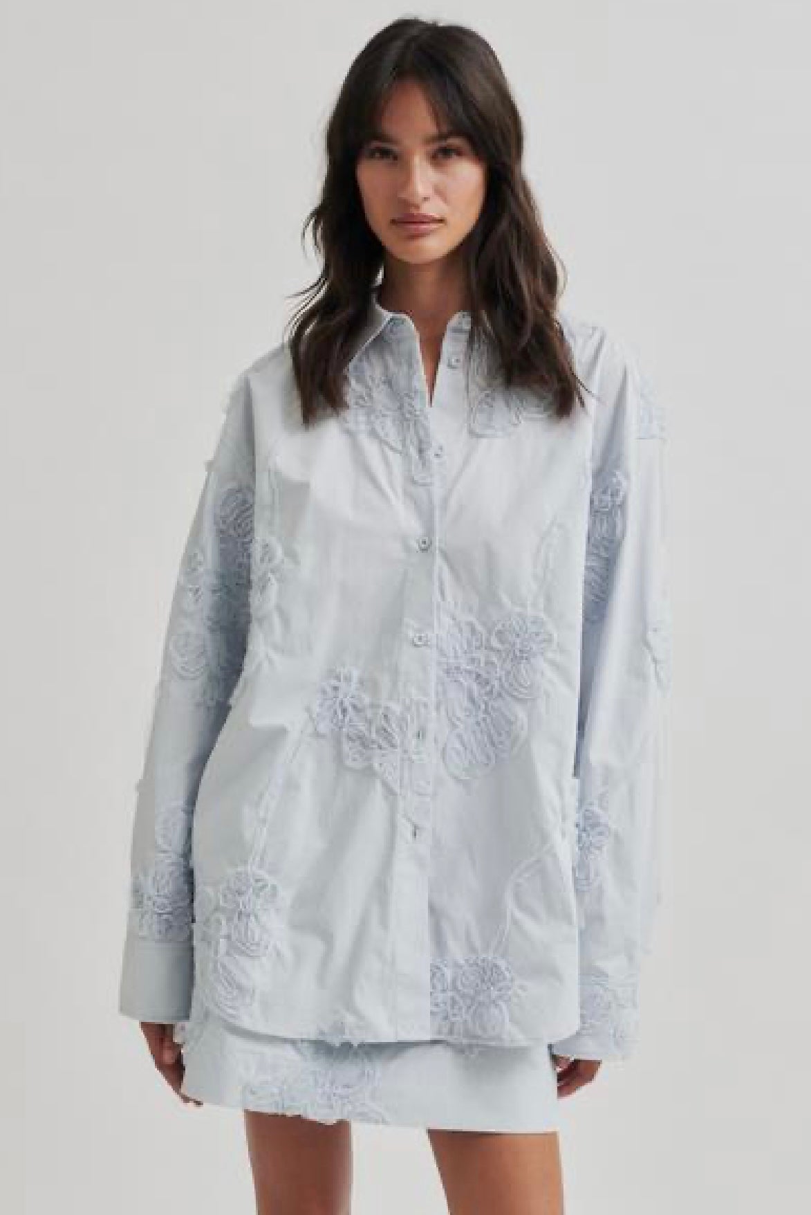 Elevate your wardrobe with the Liverno 3D Flower Shirt in from Second Female, crafted from smooth organic cotton for a soft, breathable feel. Adorned with delicate 3D mesh flower appliqués, it adds a playful, tactile twist to a classic silhouette. Designed with a regular collar, full button-through front, and long sleeves with buttoned cuffs, it also features a box pleat at the back yoke for added movement. The shaped hem and loose fit make it easy to style - whether tucked in or worn relaxed for a modern, effortless look.