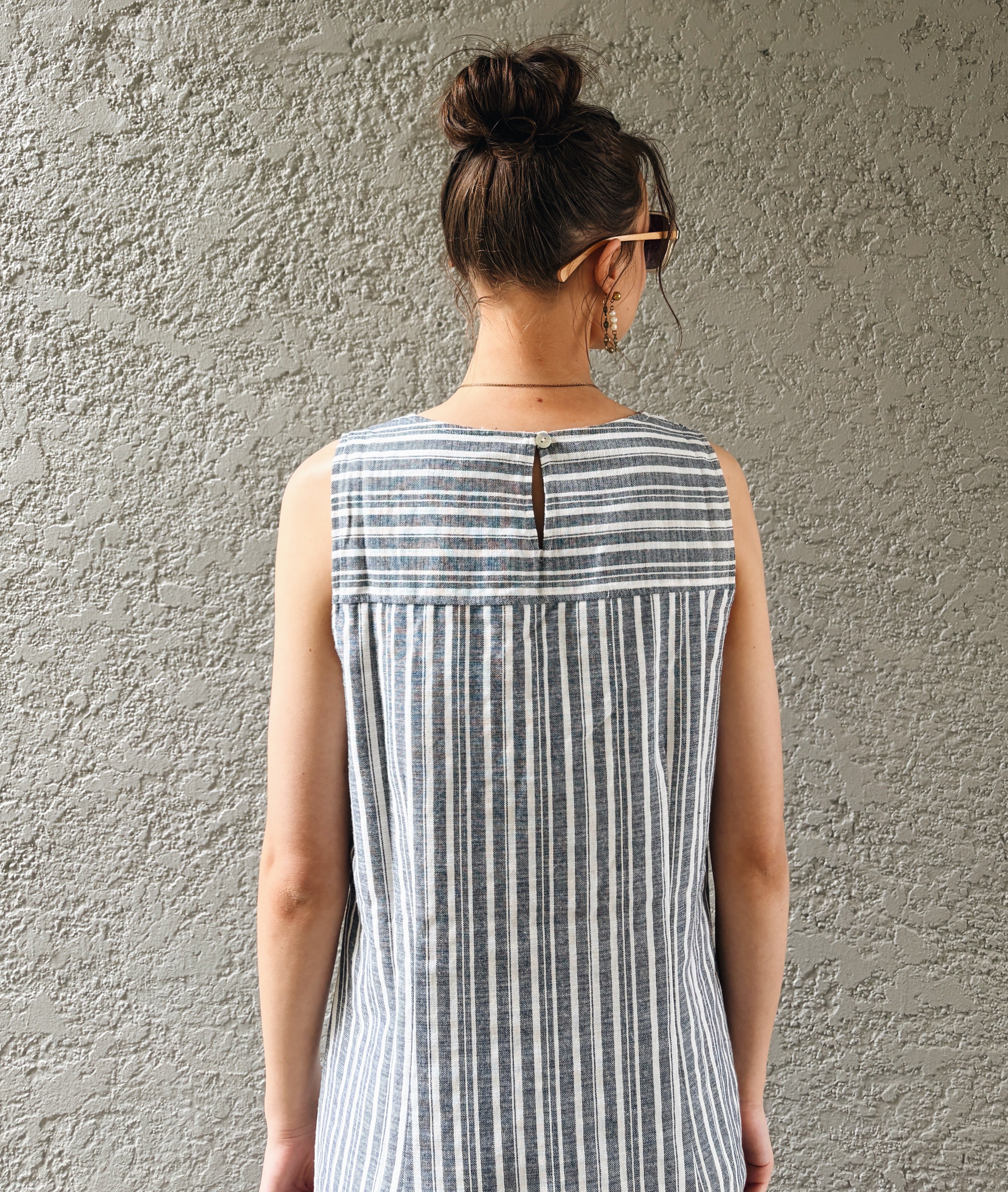 • Back neck split and button closure.